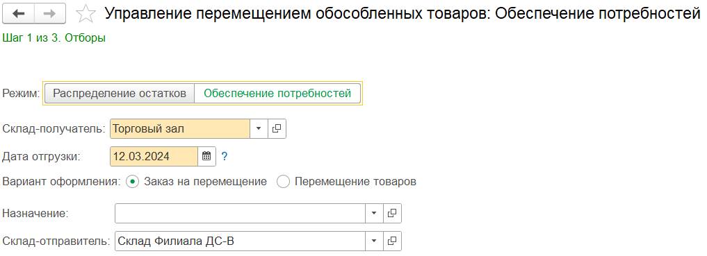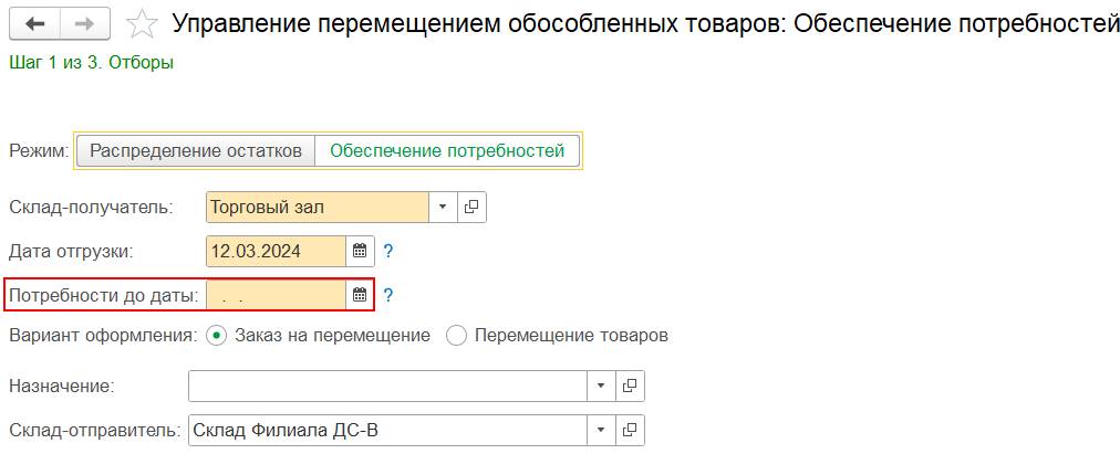 При настройке Упорядочивать потребности по заказам для обеспечения - По приоритету и дате отгрузки в рабочем месте Управление перемещением обособленных товаров:
