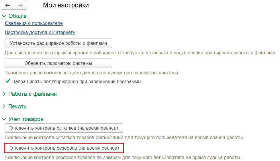 Для возможности «срочной» отгрузки товара на складе без контроля резервов необходимо наличие роли «Разрешить отключение контроля резервов товаров по заказам на время сеанса» или полных прав. Данная роль обеспечивает доступность команды НСИ и администрирование – Настройка НСИ и разделов – Склад и доставка – Отключить контроль резервов (на время сеанса), позволяющей отключить контроль резервов товаров по заказам для текущего пользователя на время сеанса. Также команда доступна в персональных настройках пользователя.