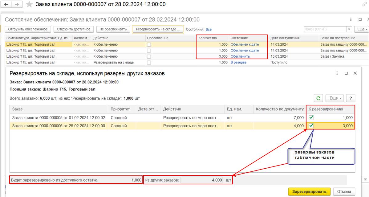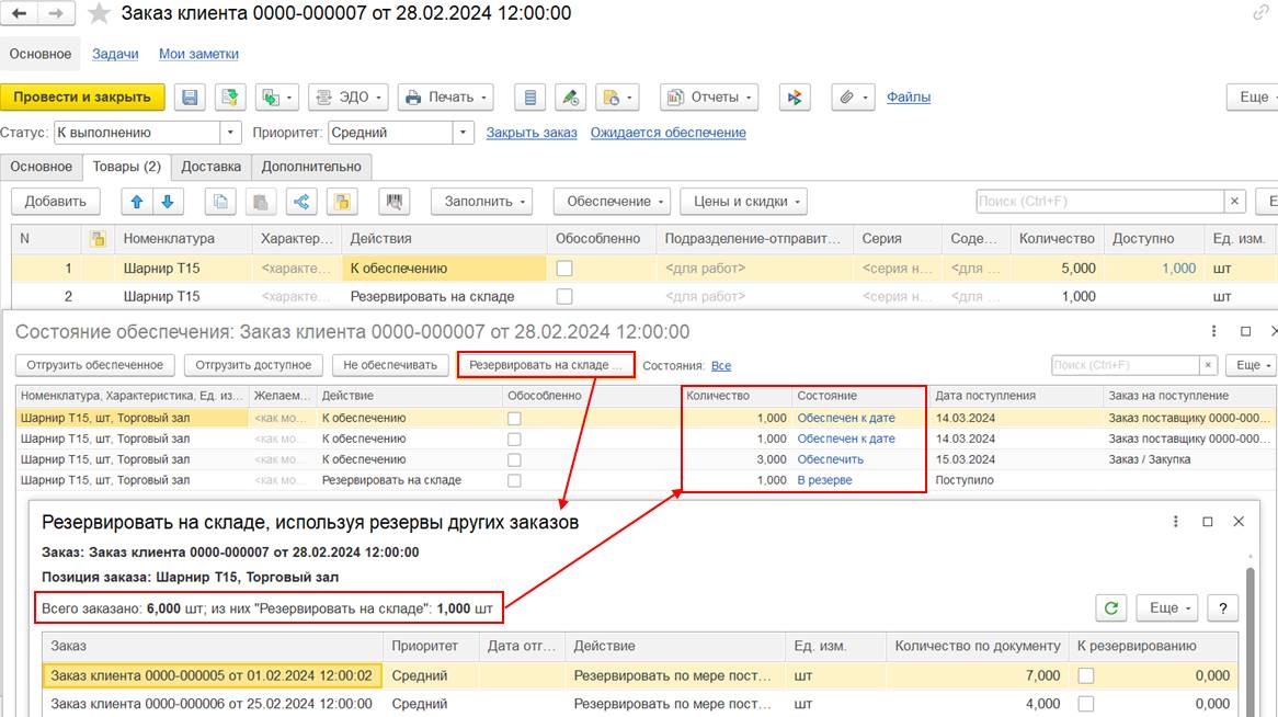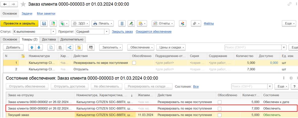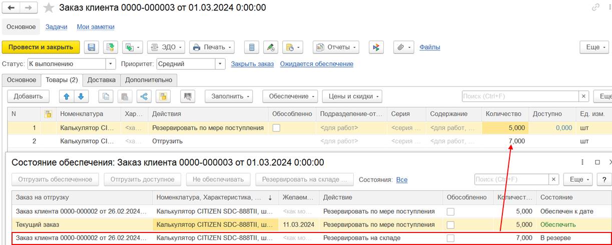 В результате проведения заказа программа автоматически уменьшит резервы по заказам с действием «Резервировать по мере поступления», чтобы свободный остаток не стал отрицательным - для заказа клиента № 0000-000002 будет уменьшен резерв в количестве 7 шт. и отображаться состояние «Обеспечить», количество 7 шт.