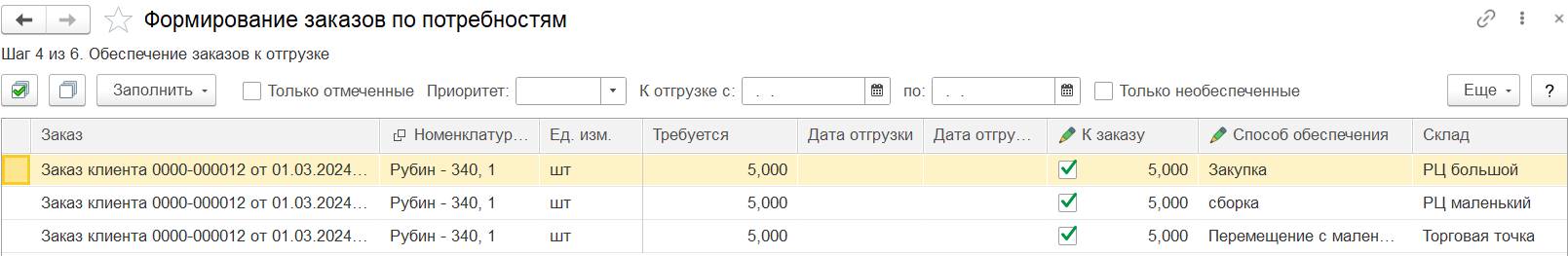 При настройке Упорядочивать потребности по заказам для обеспечения - По приоритету и дате документа в рабочем месте Формирование заказов по потребностям на шаге 4 «Обеспечение заказов к отгрузке»: