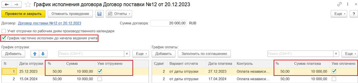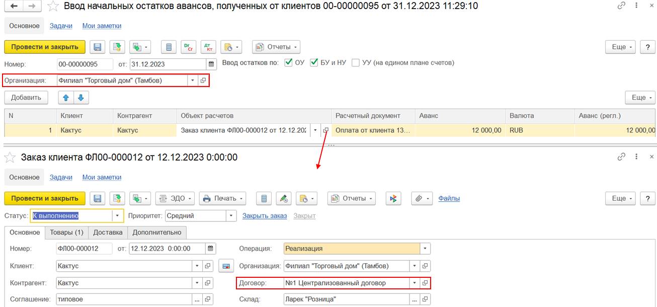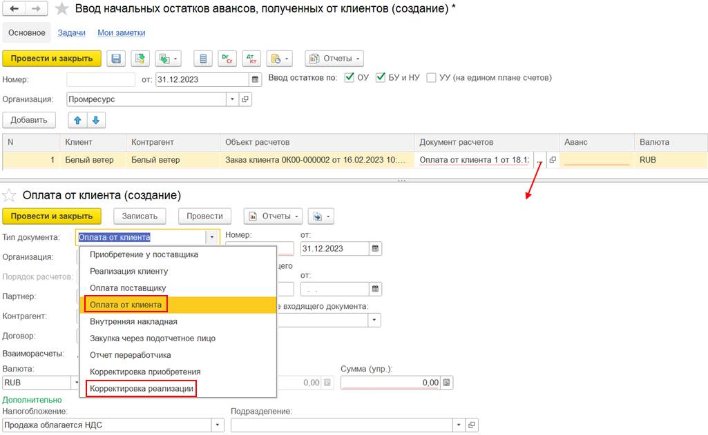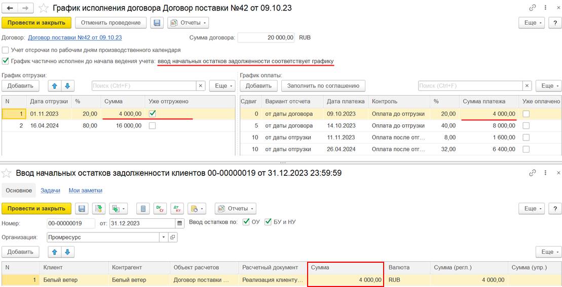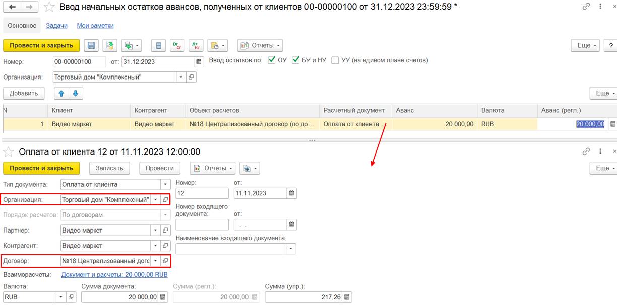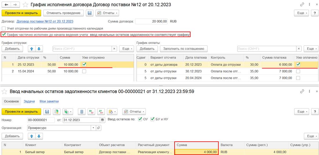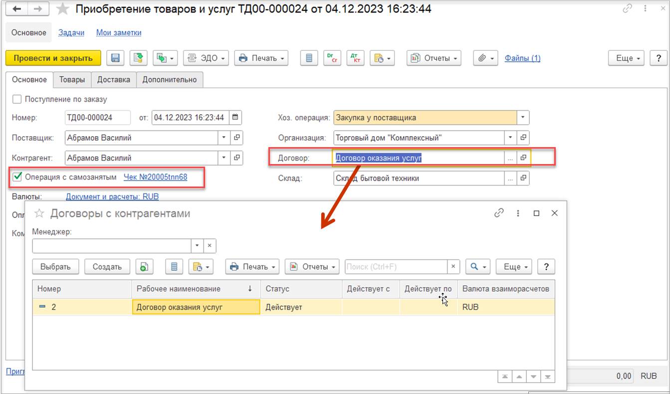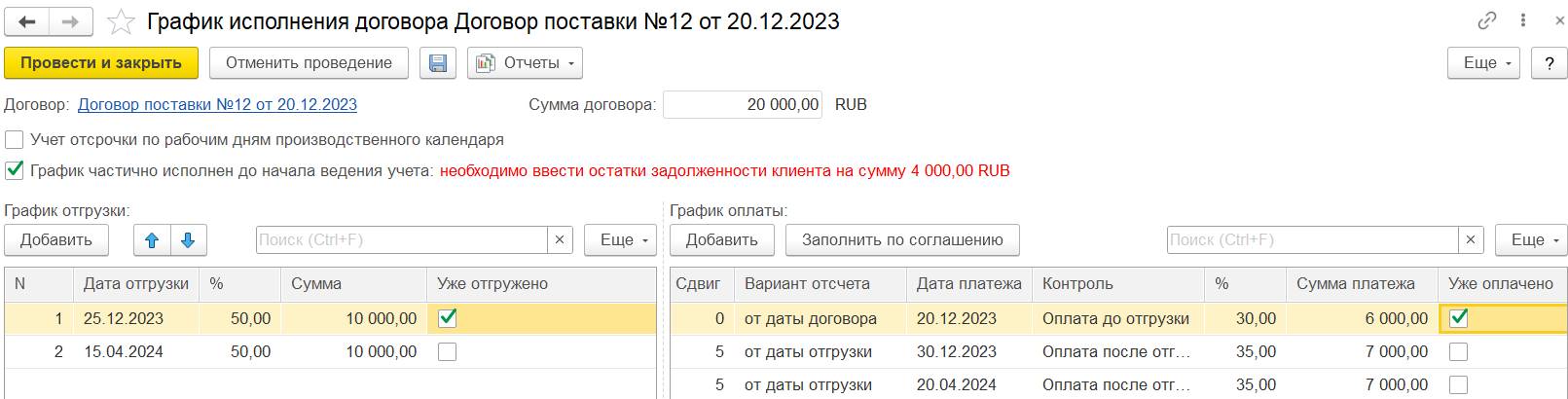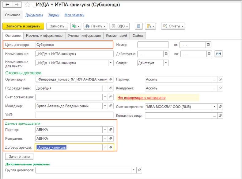 В случае использования нескольких договоров может потребоваться дополнительно отразить документ Взаимозачет задолженности (Зачет встречных обязательств).