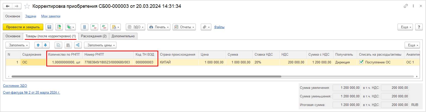 Также вывод НД/ИГК предусмотрен в печатной форме документа Корректировка назначения товаров.