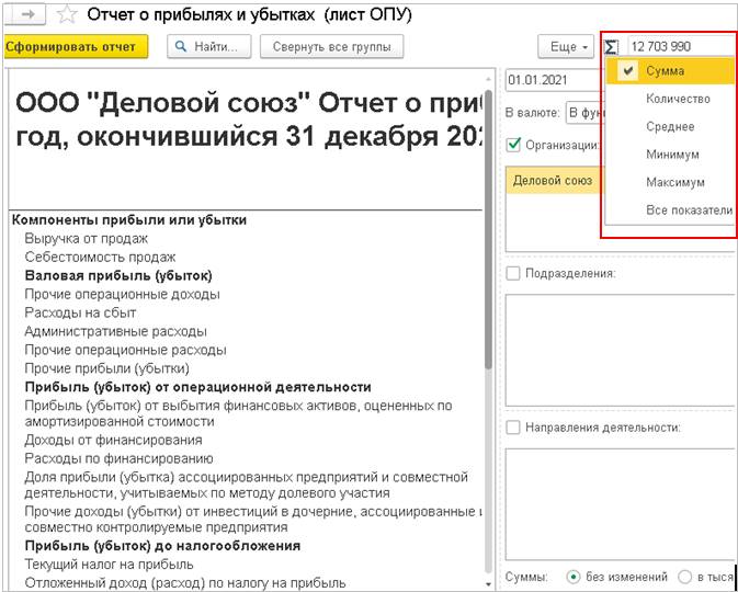 При нажатии на знак суммы система даст возможность выбрать из контекстного меню следующие значения: Сумма, Количество, Среднее, Минимум, Максимум, Все показатели.