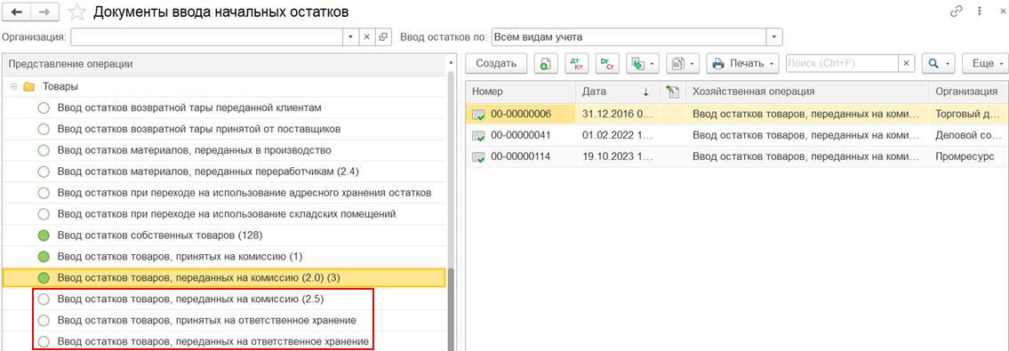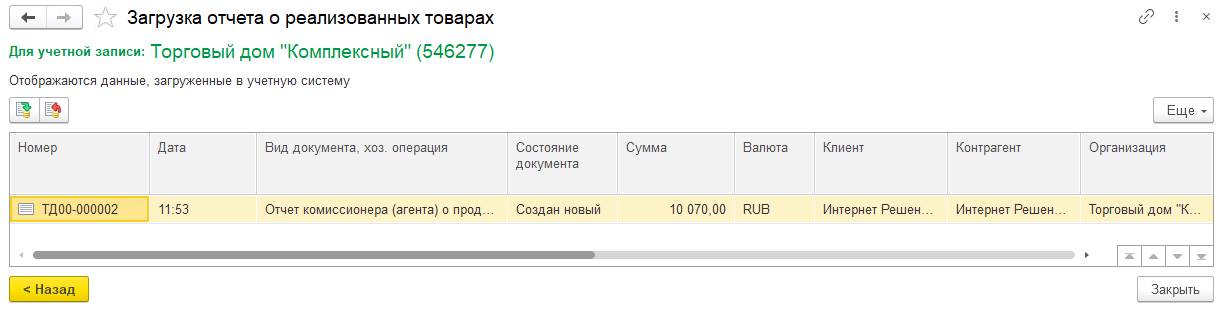 В результате загрузки данных создаются документы Отчет комиссионера (агента) о продажах, операция Реализация через комиссионера, которые отображаемые в динамическом списке на заключительном шаге работы помощника.