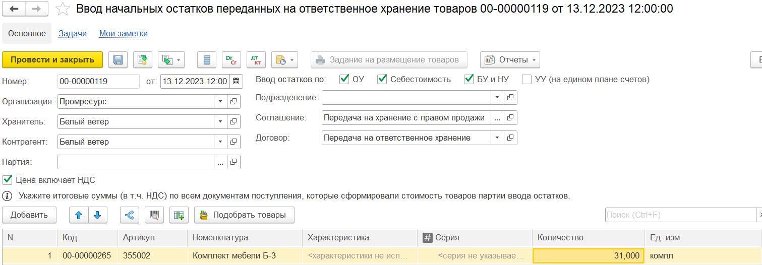 По факту доставки товаров на склад организации-продавца в информационной базе отражается документ Поступление товаров от комиссионера. Оформить документ можно из рабочего места, перейти к которому можно по ссылке Принять (x). В случае ордерной схемы документооборота на складе приемки оформляется документ Приходный ордер на товары.