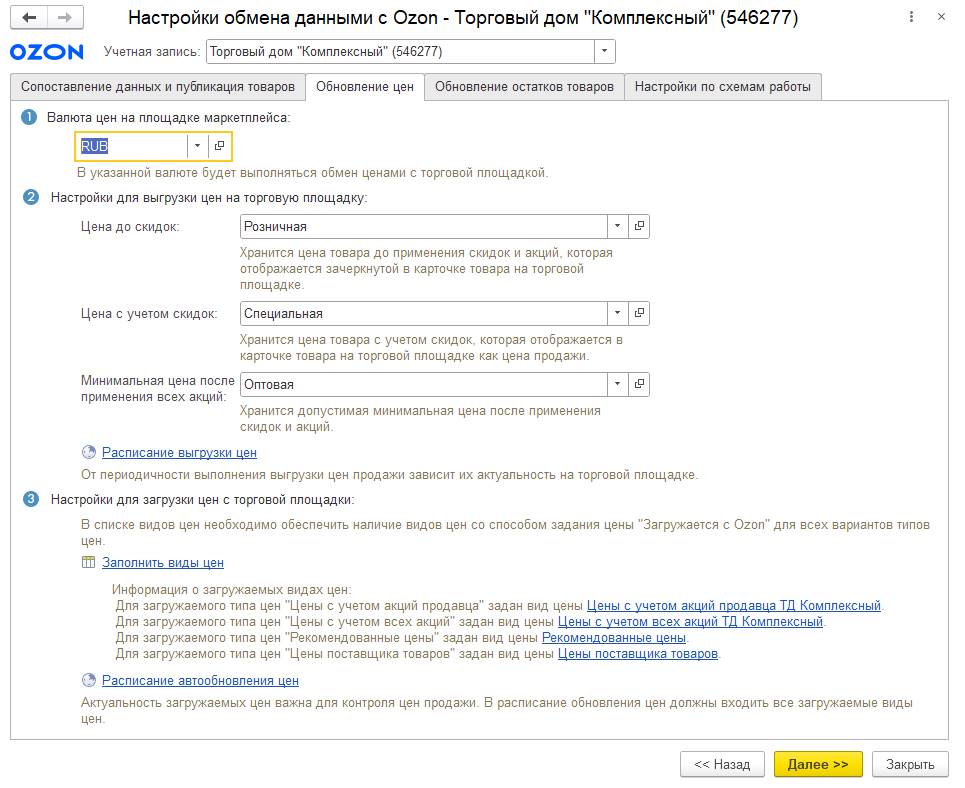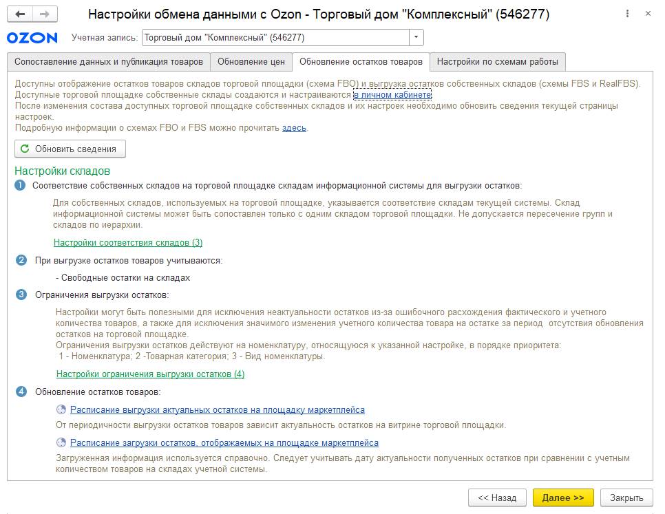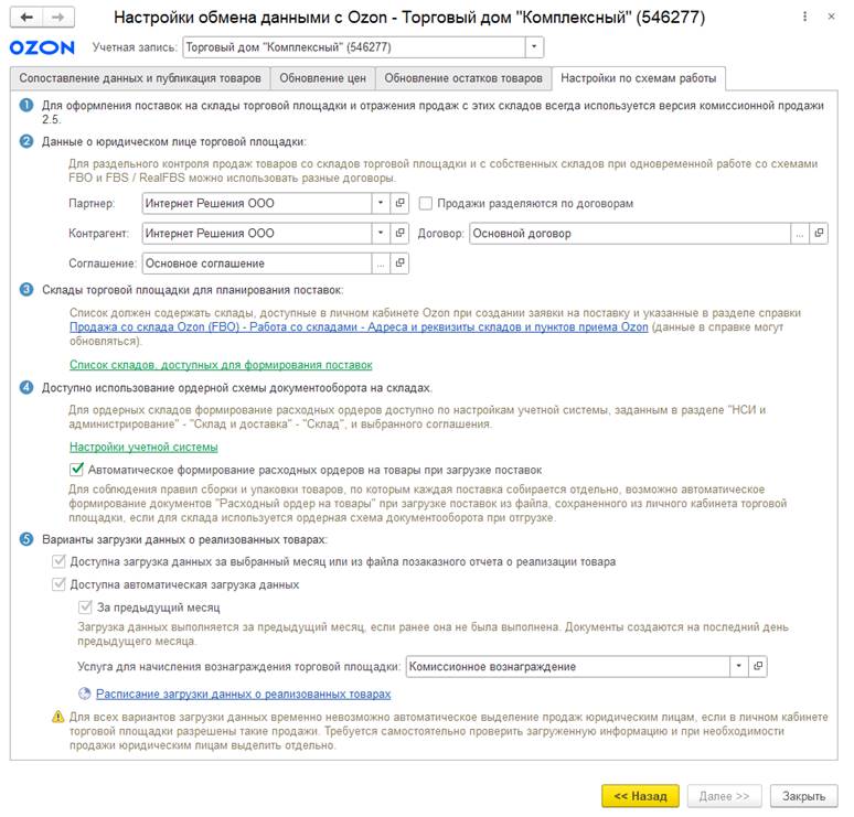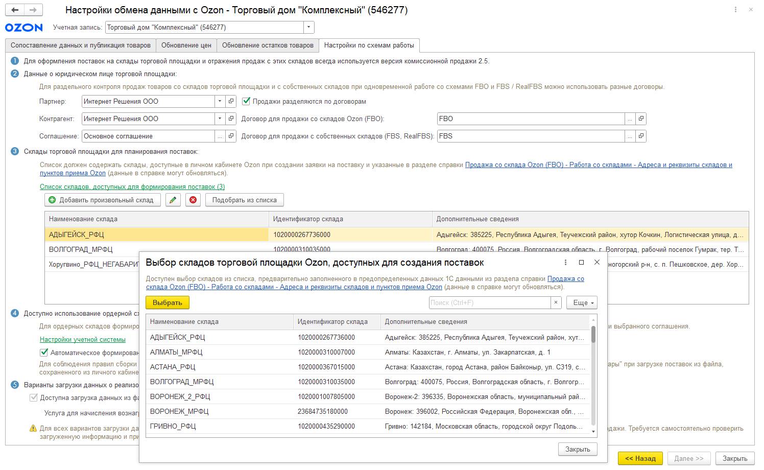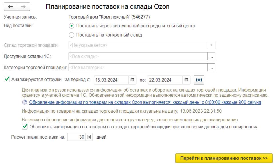 Для любого варианта планирования по умолчанию доступны все склады учетной системы, но пользователь может ограничить список складов (Доступные склады), с которых можно передавать товары на торговую площадку.