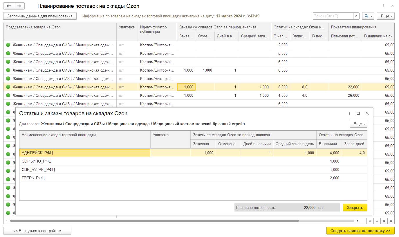 Поставки планируются в разрезе складов продавца в учетной системе. Доступны просмотр и редактирование рекомендуемого к поставке количества по складам учетной системы. В форме детализации данных по складам учетной системы к редактированию доступна только колонка Запланировать к поставке.