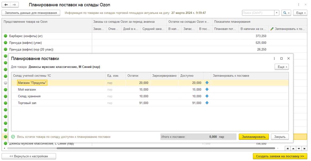 Рабочее место предназначено для планирования поставок – автоматического формирования документов Заказ клиента с видом Передача на комиссию, которыми в информационной базе оформляются заявки на поставку товаров на склады торговой площадки. Документы формируются на основе остатков товаров в учетной системе 1С, а также информации по оборотам товаров на торговой площадке.