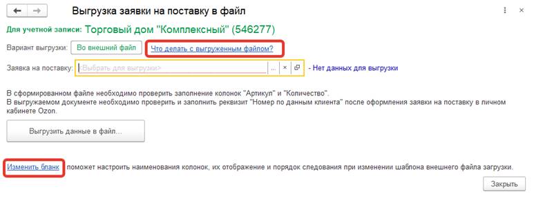 Помощник позволяет выгрузить в файл определенную заявку на поставку или возврат, созданную в информационной базе, для последующей загрузки в личный кабинет торговой площадки.