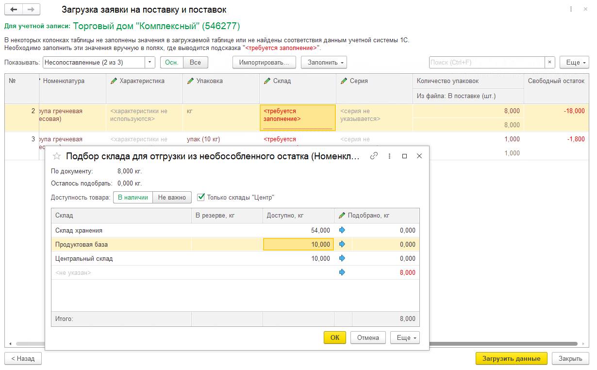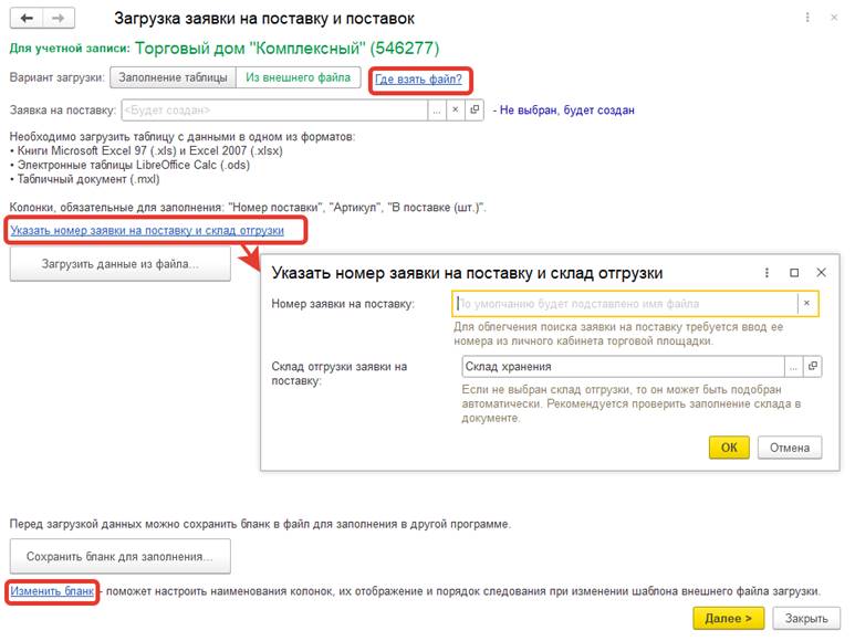 При загрузке заявки по ссылке Указать номера заявки на поставку и склада отгрузки можно указать соответствующей параметры. По умолчанию номер поставки заполняется именем файла, а склад берется из соглашения.