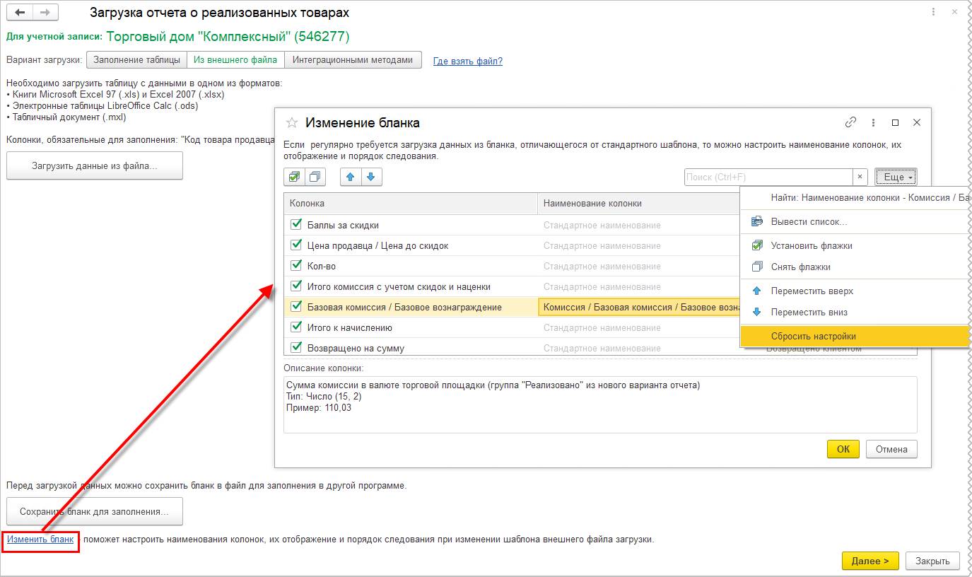 В случае изменения в бланке состава колонок, их порядка или наименований доступно редактирование бланка загрузки по ссылке Изменить бланк. В форме изменения бланка отображается описание колонки. При установке нового наименования колонки можно использовать комбинацию значений, разделяемых символом "/". Доступен сброс настроек до предустановленных по умолчанию.