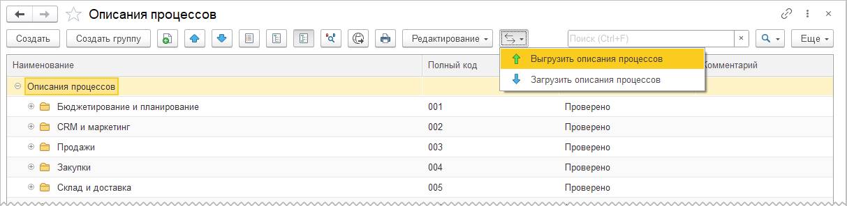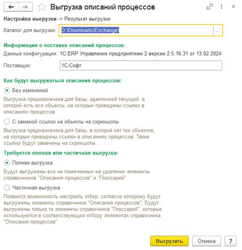 Для описаний процессов поддержана выгрузка и последующая загрузка в другую информационную базу. При выгрузке возможна замена ссылок на объекты информационной базы на скриншоты этих объектов. При загрузке описаний предусмотрена возможность сравнение и объединение текстов описаний в выгрузке и в текущей базе.