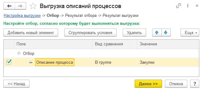 Если выбран вариант Частичная выгрузка, Без изменений, то по кнопке Далее >> происходит переход на следующий шаг – указания отбора, который будет применяться к выгружаемым описаниям процессов. Например, можно выбрать процессы из определенной иерархической группы или задать список процессов.