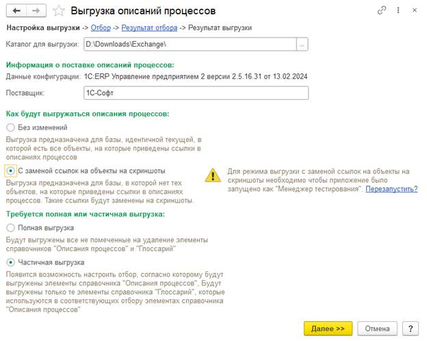 Для выполнения выгрузки С заменой ссылок на объекты на скриншоты необходимо запустить информационную базу в режиме "Менеджер тестирования". Для запуска в этом режиме можно воспользоваться ссылкой Перезапустить в подсказке.