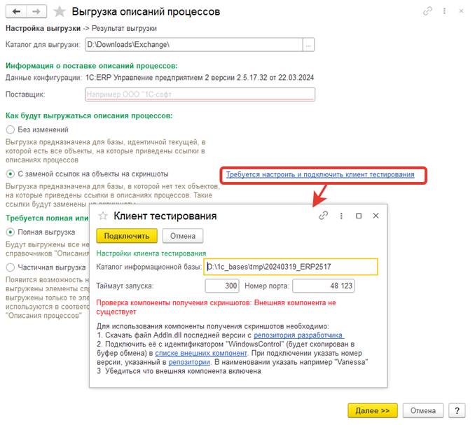 Выгрузка в данном случае может занять значительное время. В процессе выгрузки в окне информационной базы, запущенной в режиме "клиент тестирования" будут открываться формы для снятия скриншотов. В это время нельзя интерактивно вмешиваться в работу приложения в режиме клиент тестирования.
