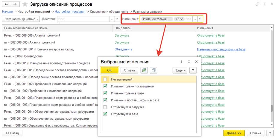 Если производится настраиваемая загрузка с возможностью сравнения и объединения описаний в базе и из файла, то после выбора загружаемого файла и режима загрузки, как описано выше, по кнопке Далее >> выполняется сравнение и отображается таблица с результатами сравнения.