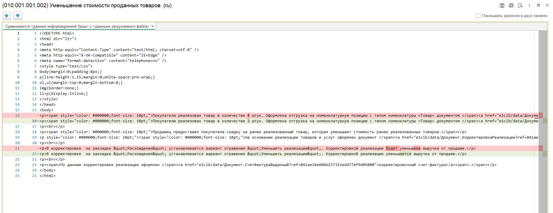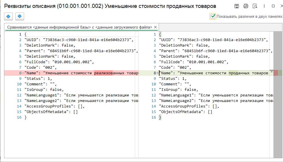 В графе Изменение указывается отличие между описаниями в базе и файле загрузки. Текст описания отличий в графе Изменения является гиперссылкой, по которой открывается форма просмотра отличий. Возможно два режима просмотра:
