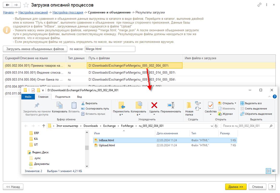 Описания, для которых выбран вариант Объединить, при переходе к следующему шагу будут выгружены в отдельные подпапки в папке Merge, которая будет создана в папке загрузки. Имя папки для каждого описания содержит код языка и полный код описания процесса. В каждой паке будет сохранены с описаниями из базы и из файла загрузки с добавлением к имени соответствующего обозначения: