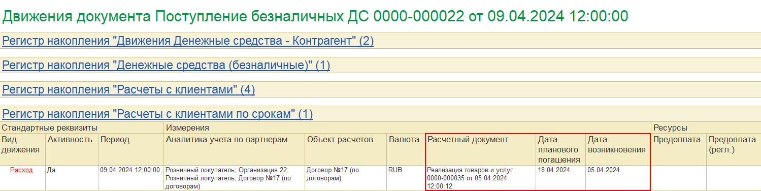 Оформляем еще Реализацию от 10.04.24 с датой платежа 13.04.24, проведенную позже аванса (оплаты от 09.04.24). При проведении Реализации от 10.04.24 перезачет оплаты не выполняется.