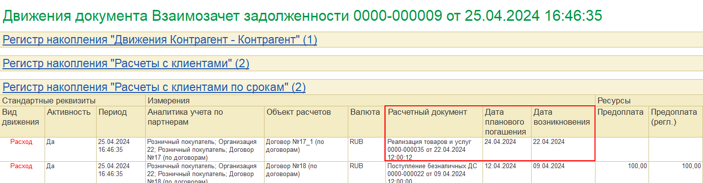 При проведении взаимозачета задолженности на дату 25.04.24 аванс от 09.04.24 распределяется по накладной от 22.04.24 с минимальной датой платежа 24.04.24. Поскольку взаимозачет проводится на дату после накладных, то такой взаимозачет позиционируется как постоплата.
