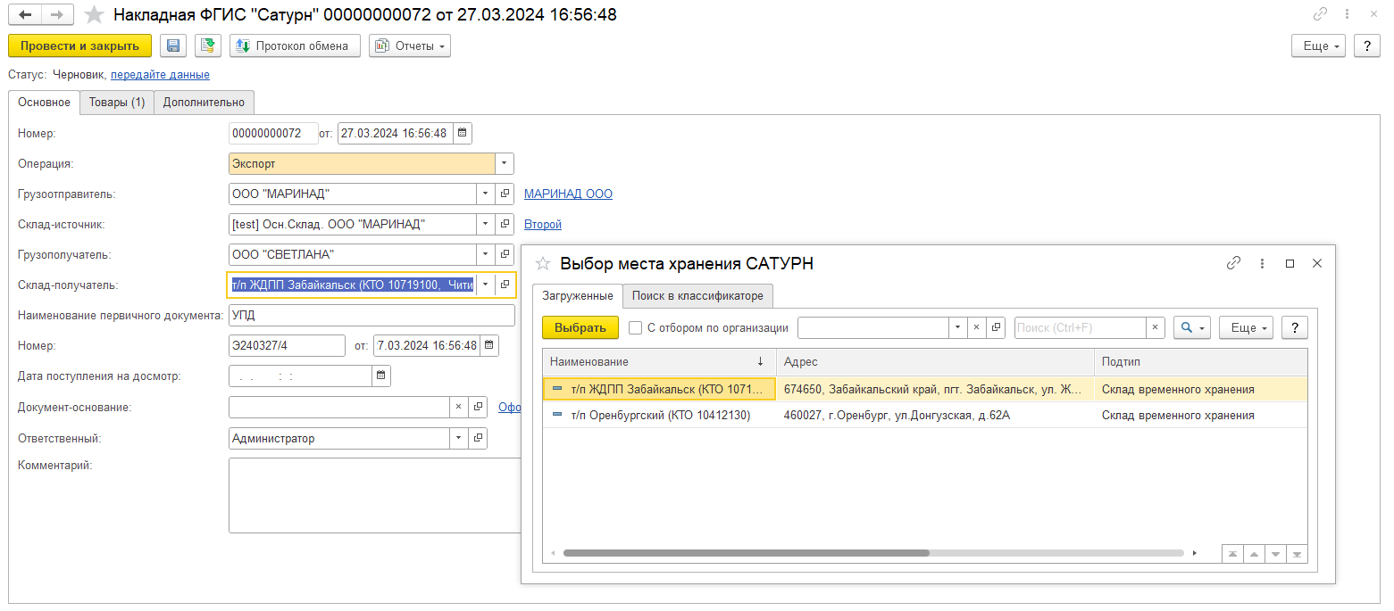 ■ Для накладных ФГИС "Сатурн" поддержаны операции частичной приемки, возврата груза, приемка возвращаемого груза, отправки на экспорт