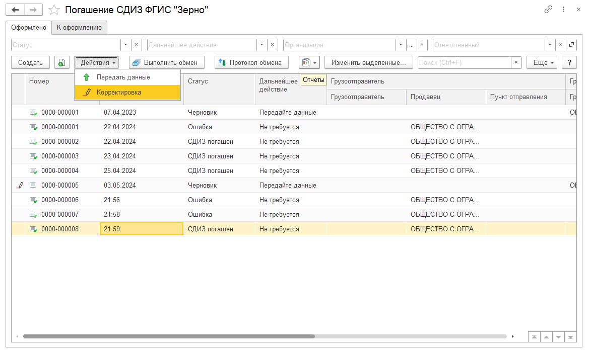 ■ из списка Оформление СДИЗ ФГИС "Зерно" по кнопке Действия - Корректировка;