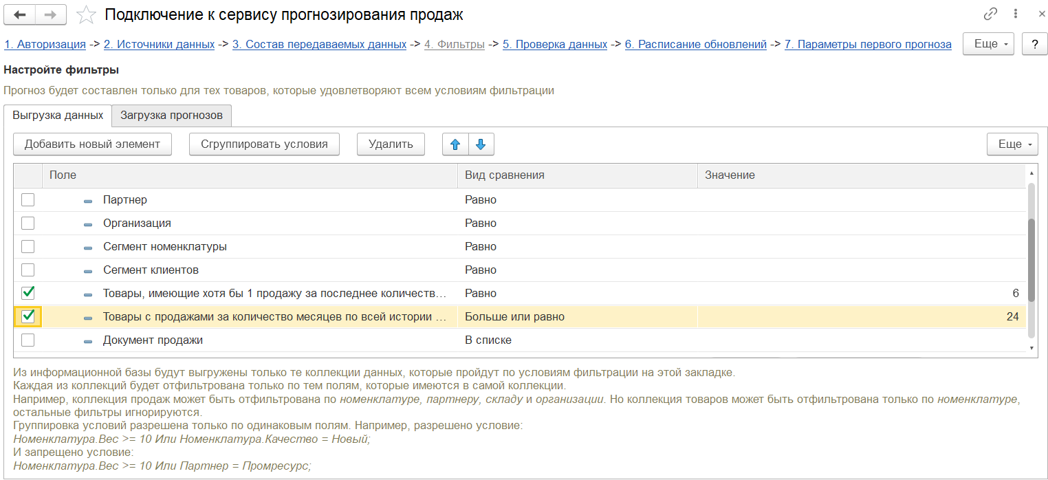 В помощнике подключения к сервису прогнозирования продаж в расширенном режиме на этапе 4 «Фильтры» добавлены новые отборы: