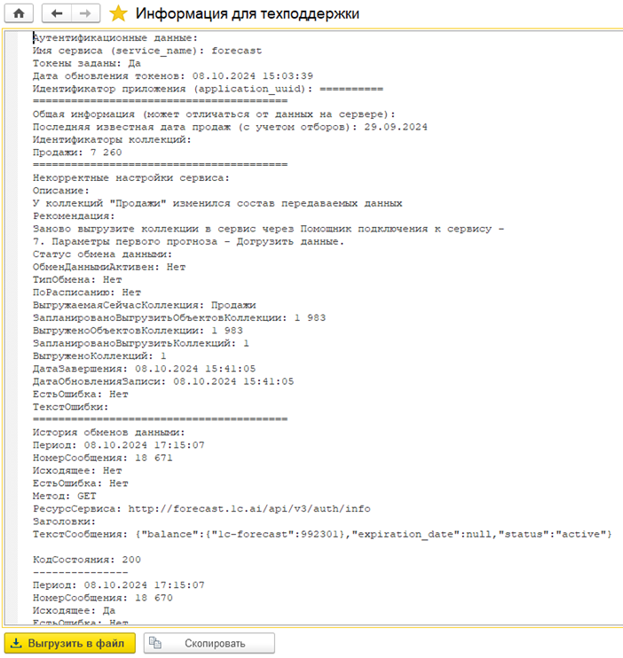 Информацию для техподдержки можно скопировать в буфер обмена, либо выгрузить в текстовый файл.