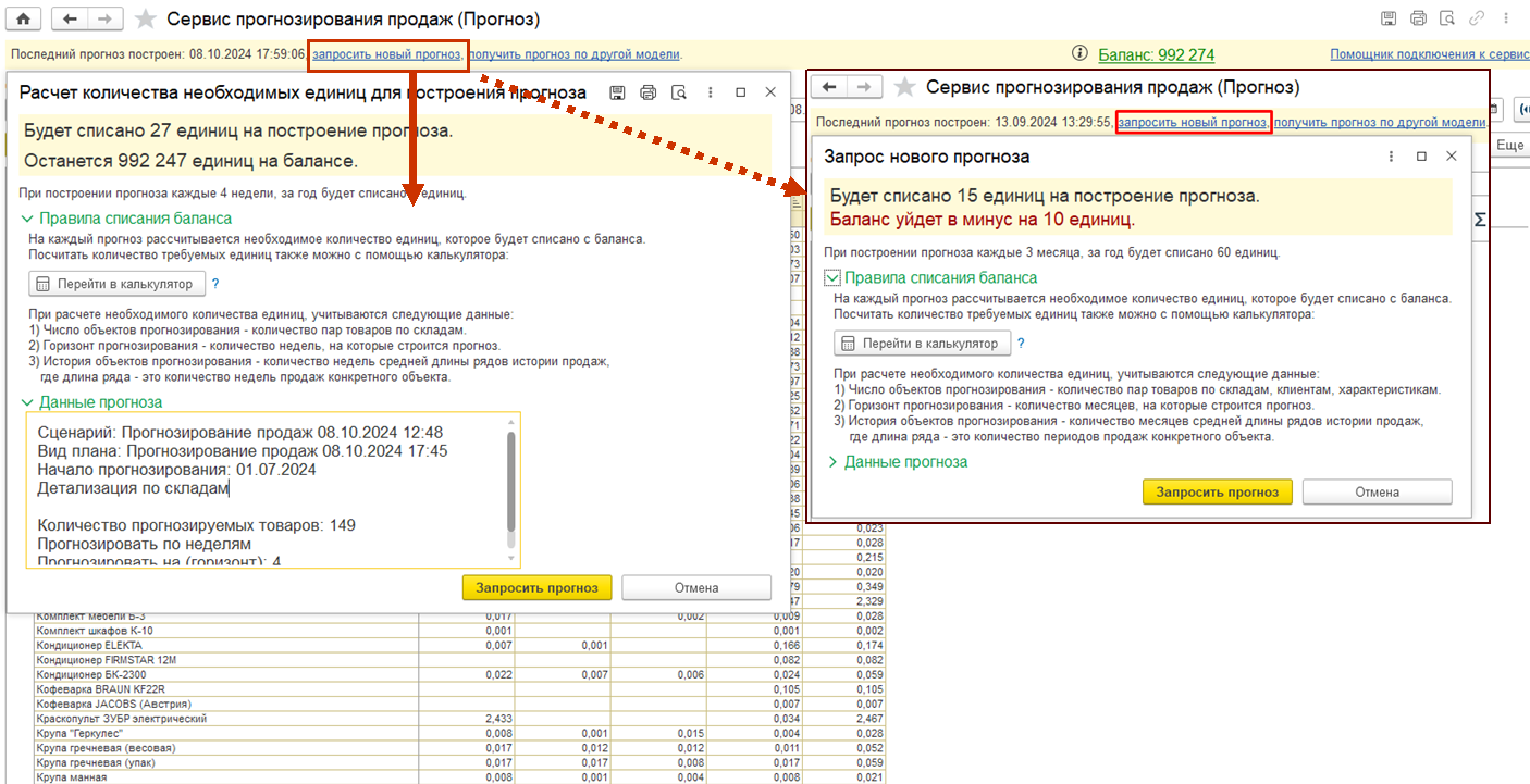 ■ В связи с выходом сервиса прогнозирования в тираж реализована функциональность отображения баланса сервиса прогнозирования и информирования пользователя о том, сколько единиц баланса будет затрачено на новый прогноз.