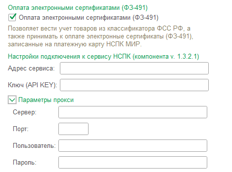 Добавлена возможность работы компоненты интеграции с электронными сертификатами НСПК через прокси. Настройки прокси задаются в разделе НСИ и администрирование – Настройки НСИ и разделов – Продажи – Розничные продажи.