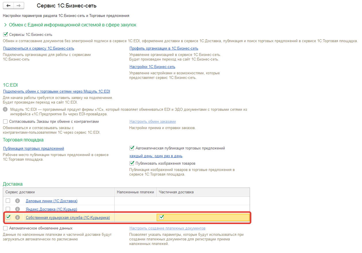 Возможность частичной доставки включается установкой флага Частичная доставка в строке Собственная курьерская служба (1С-Курьерика) таблицы Доставка в форме настроек НСИ и администрирование – Настройка интеграции – Обмен электронными документами – Сервисы 1С:Бизнес-сеть.