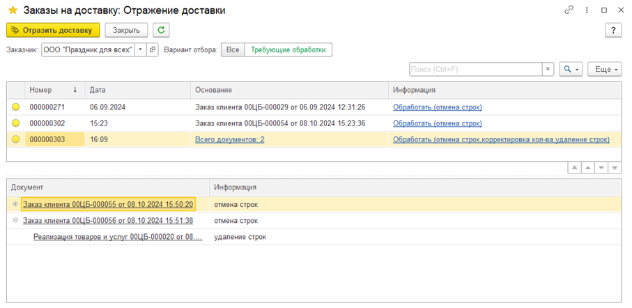 ■ в документе Заказ клиента, отменяются строки по непринятым товарам (если товар принят частично, то количество делится на две строки с указанием принятого и возвращенного товара);