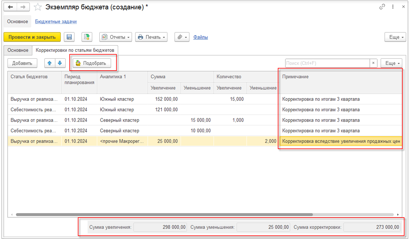 Для исправительного экземпляра бюджета выводятся актуальные значения суммы и количества по всем статьям бюджета. В аналитической записке выводятся примечания по указанным причинам корректировки.