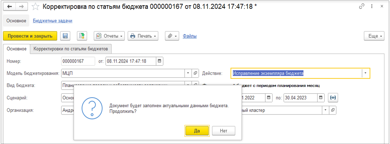 По умолчанию в поле Действие устанавливается значение Корректировка по статьям бюджета, но при необходимости можно выбрать Исправление экземпляра бюджета.