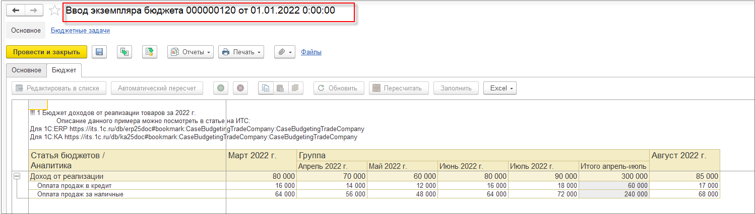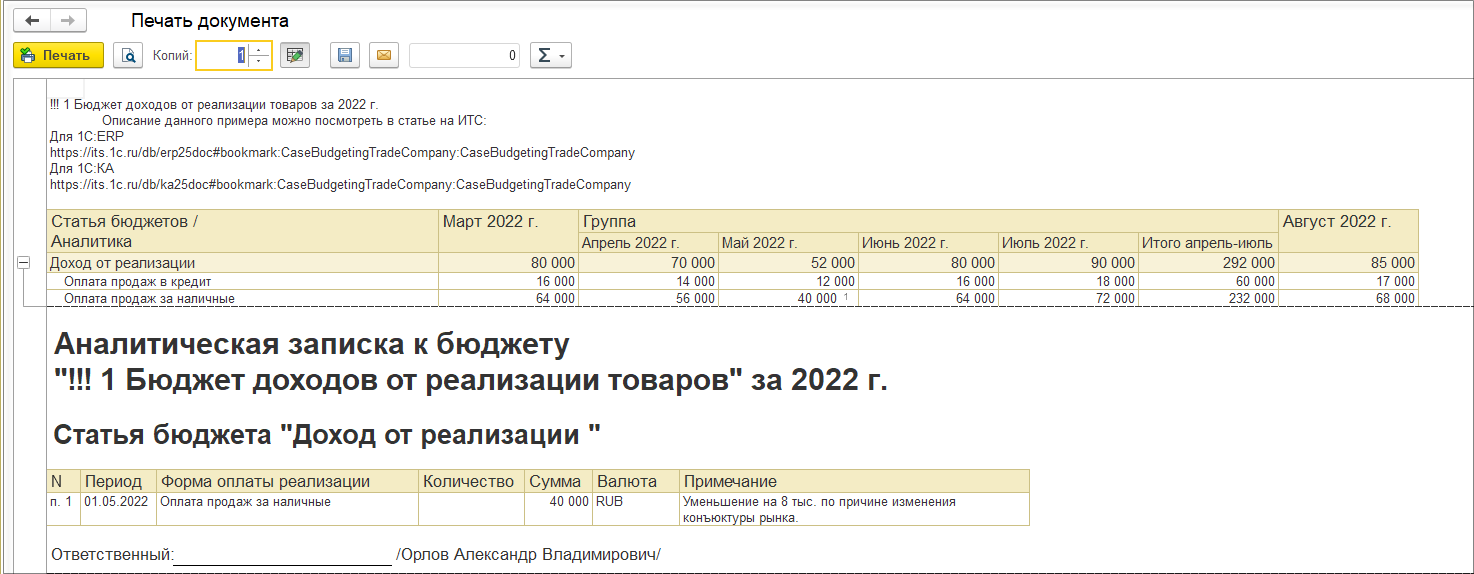 Печатные формы бюджетов для исправления экземпляра бюджета выводят актуальные данные бюджета в соответствии с текущим исправлением.