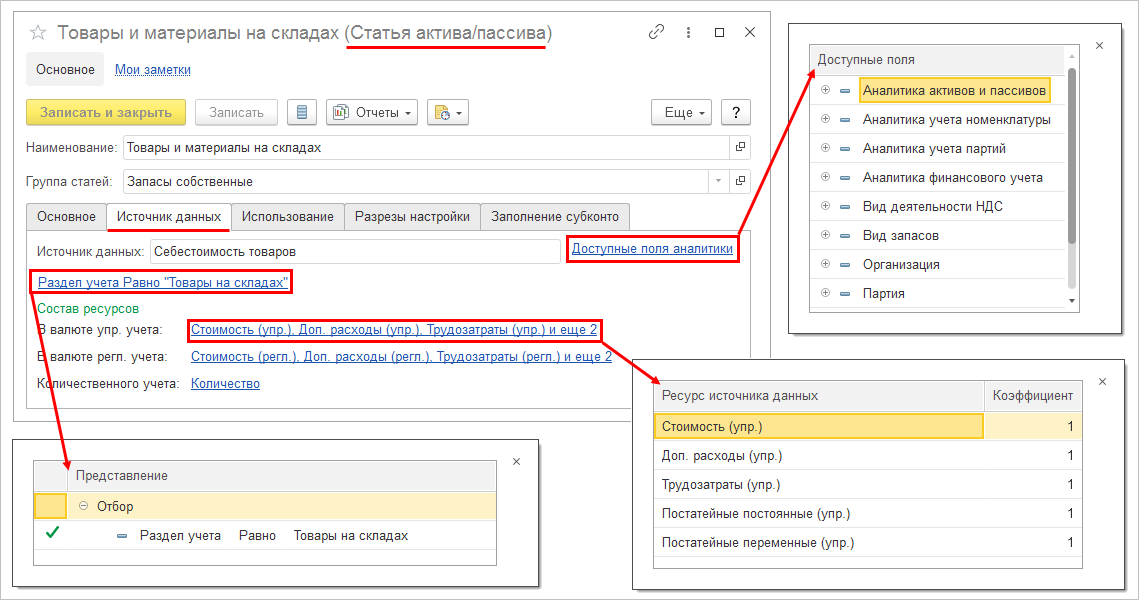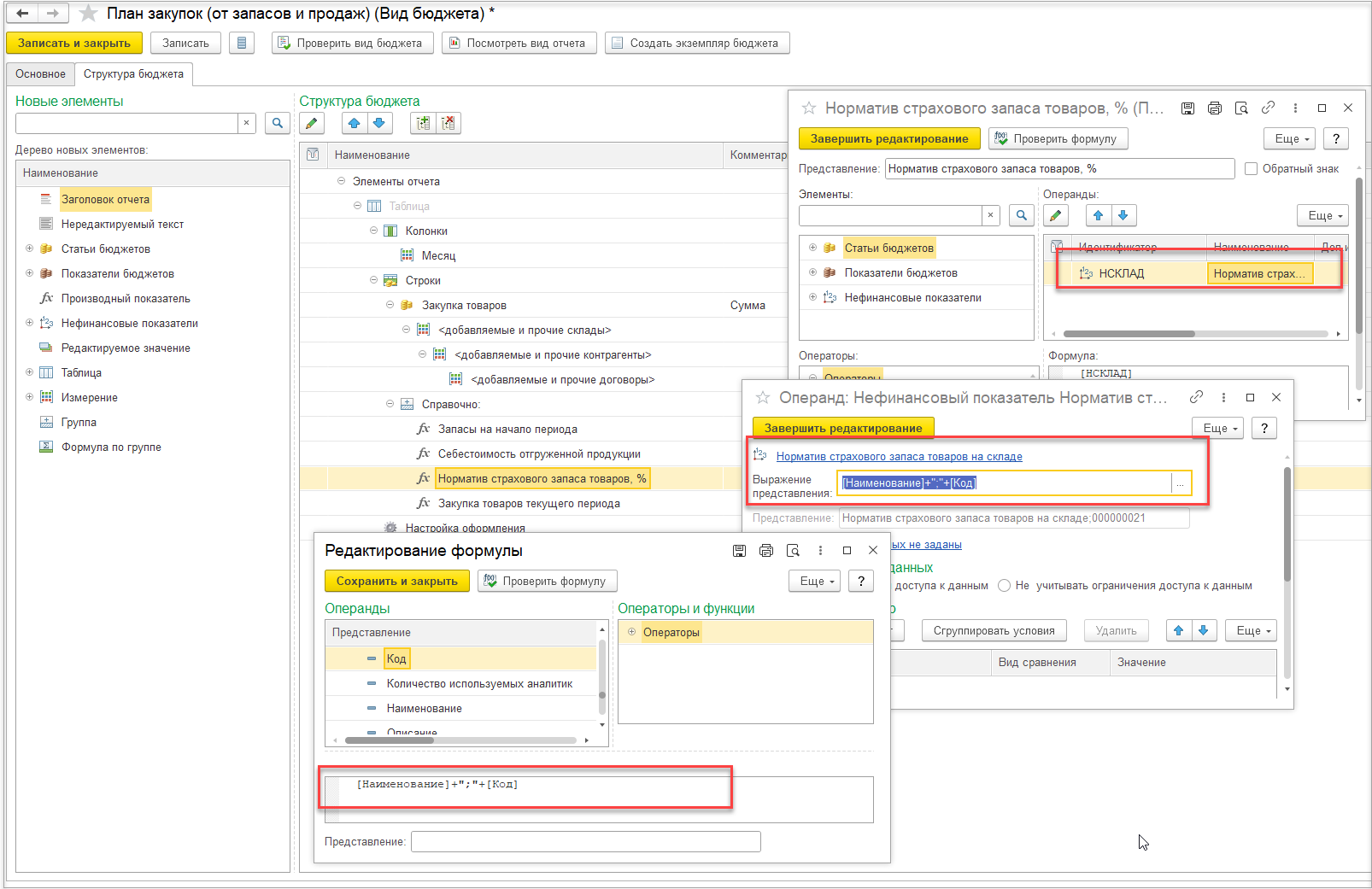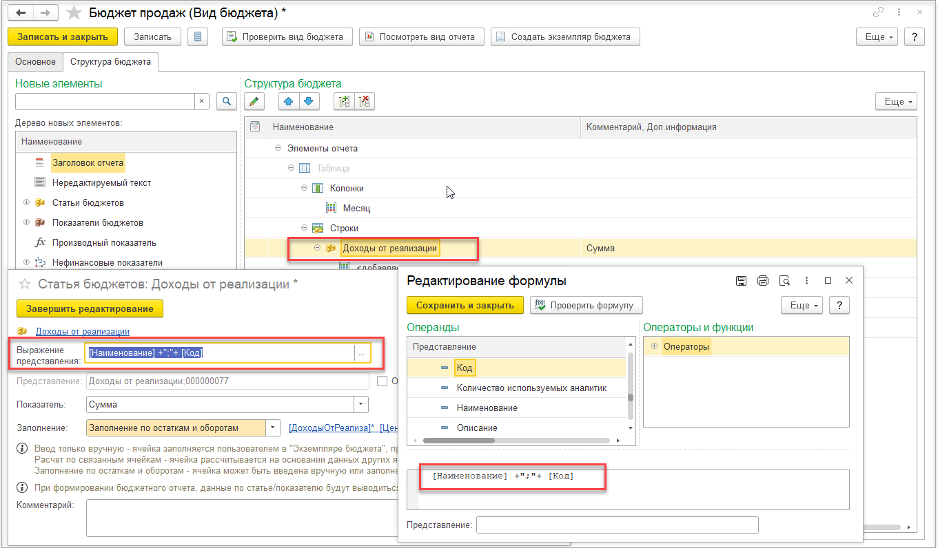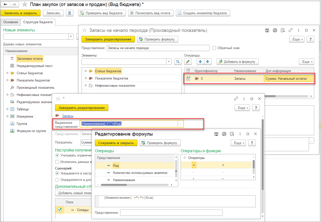 Для вида бюджетов с вводом плановых данных на форме настройки статьи бюджетов добавлено поле Выражение представления. Если оно задано, то представление статьи бюджетов формируется автоматически и недоступно для редактирования.