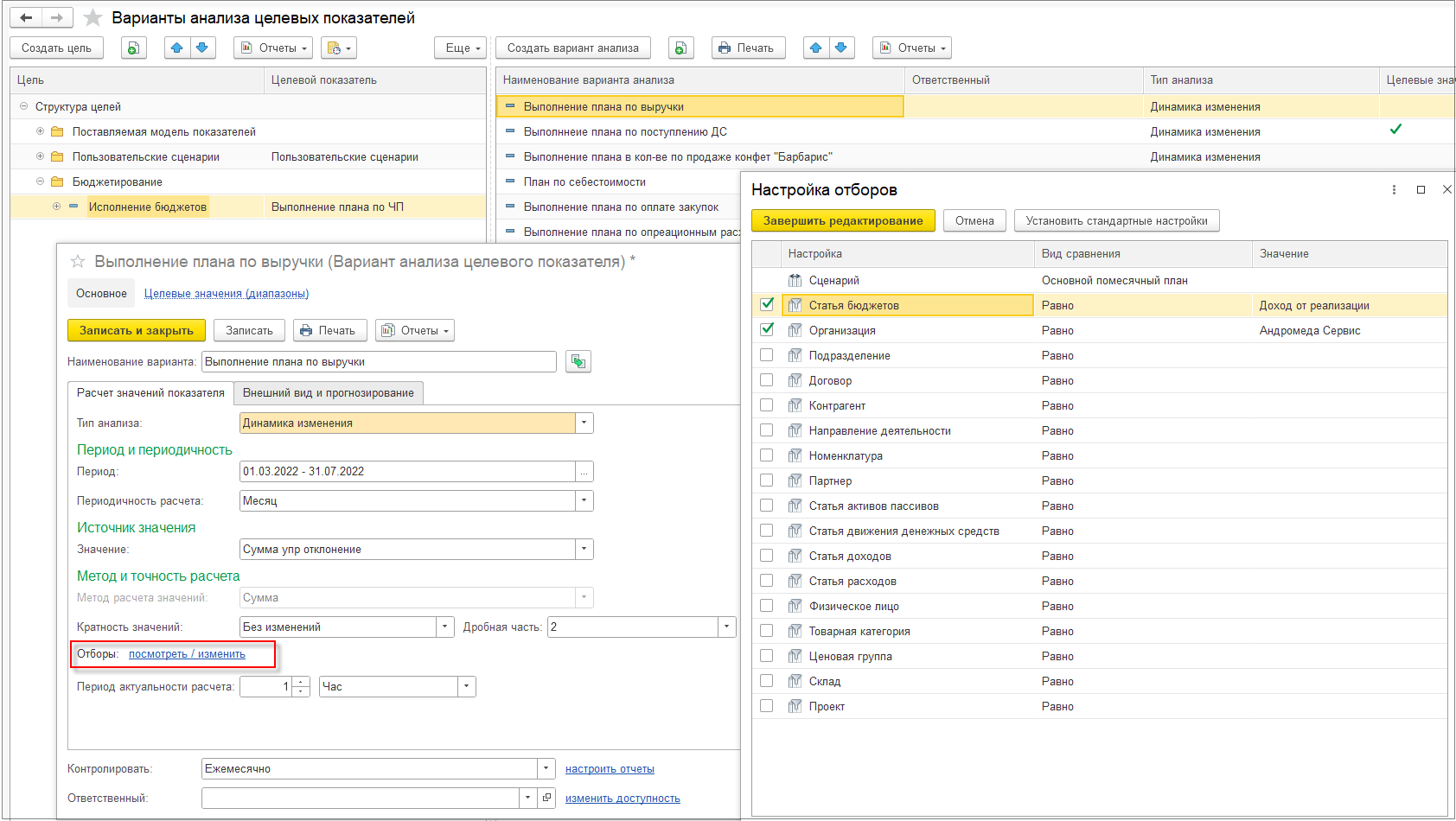 При формировании варианта анализа целевого показателя можно настроить отбор, заполнив в окне Настройка отборов параметры: Настройка, Вид сравнения, Значение.