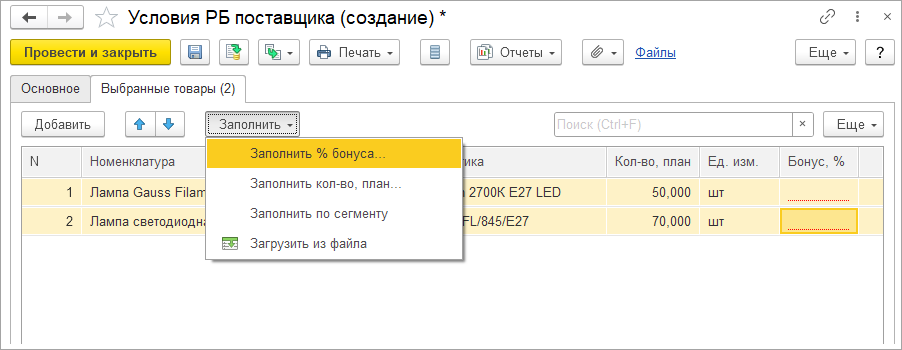 ■ Документ Условия ретро-бонусов поставщика - настройка конкретных условий бонуса от определенного поставщика на определенный период.