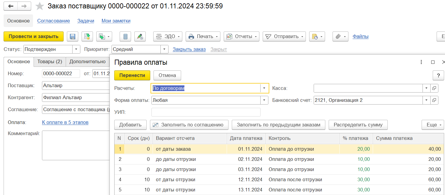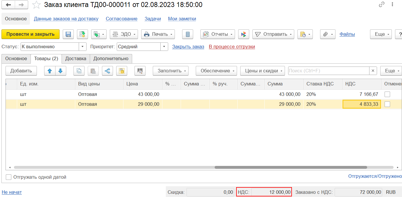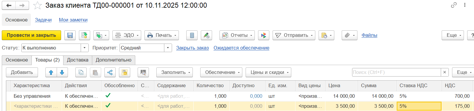 На закладке Основное вводятся основные реквизиты заказа: