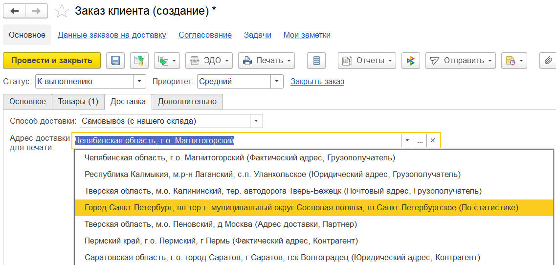 ■ В зависимости от выбранного способа отгрузки / доставки далее указывается точный Адрес или выбирается пункт выдачи или постамат из классификатора СДЭК: