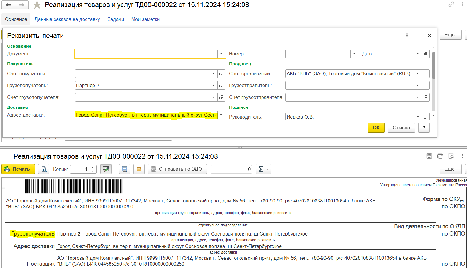 ■ Основания - документ или несколько документов информационной базы, по которым выполняется доставка.