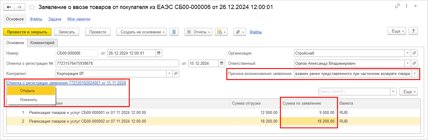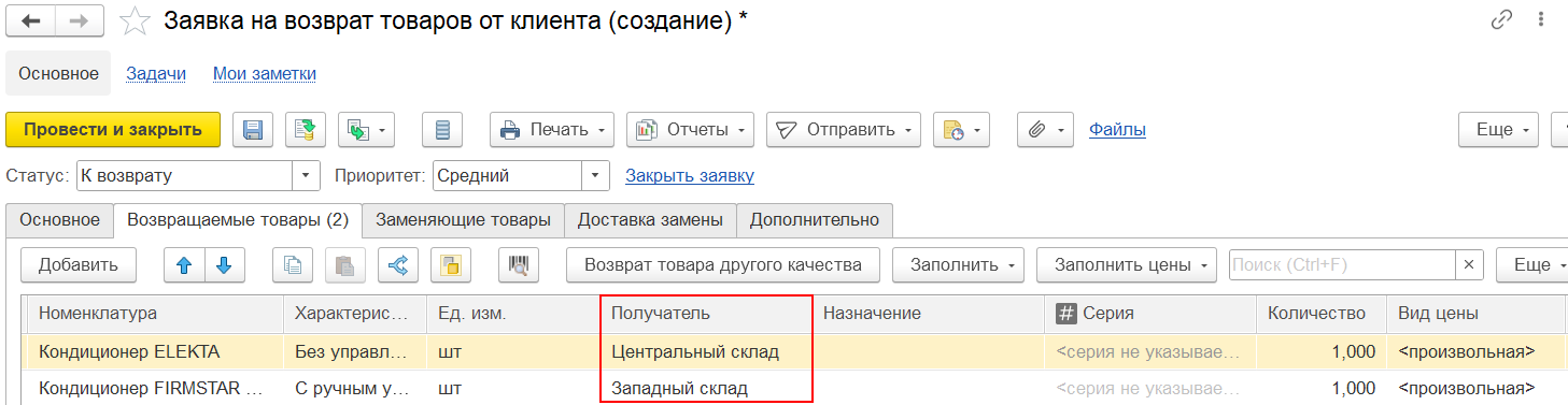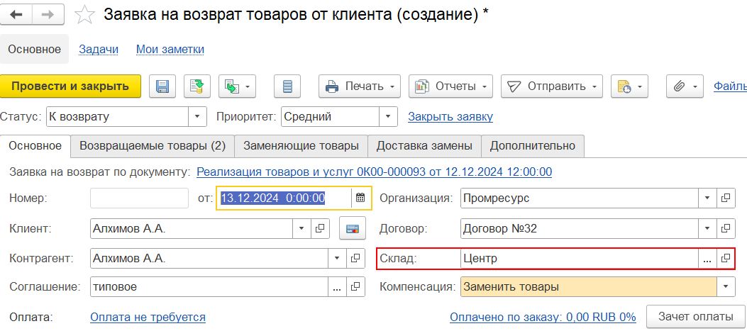 ■ Заявка на возврат товаров от клиента,