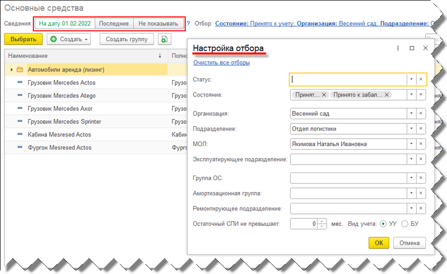 При выборе подразделения в списке выбора предусмотрен переключатель Действует / Не действует / Все, который позволяет установить отбор по статусу. Форма выбора по умолчанию открывается с быстрым отбором по статусу Действует.