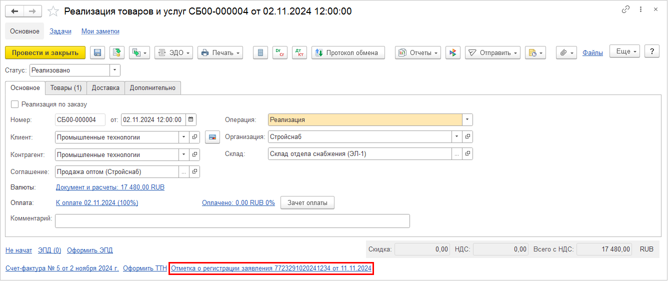 По кнопке Завершить автоматически будет создан электронный документ (при необходимости) и открыта форма электронного документа.