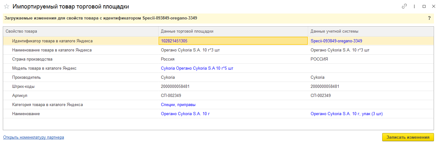 При необходимости можно перейти по ссылке Открыть номенклатуру партнера для редактирования сопоставленных данных номенклатуры.
