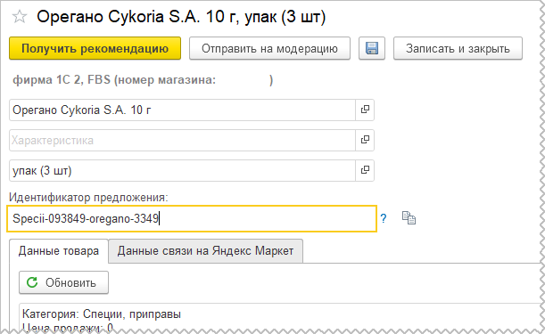 В карточке публикации товара предусмотрено ручное редактирование идентификатора предложения товара до момента передачи публикации на модерацию. Требования к идентификатору - любая строка до 255 символов, уникальная в пределах кабинета продавца.
