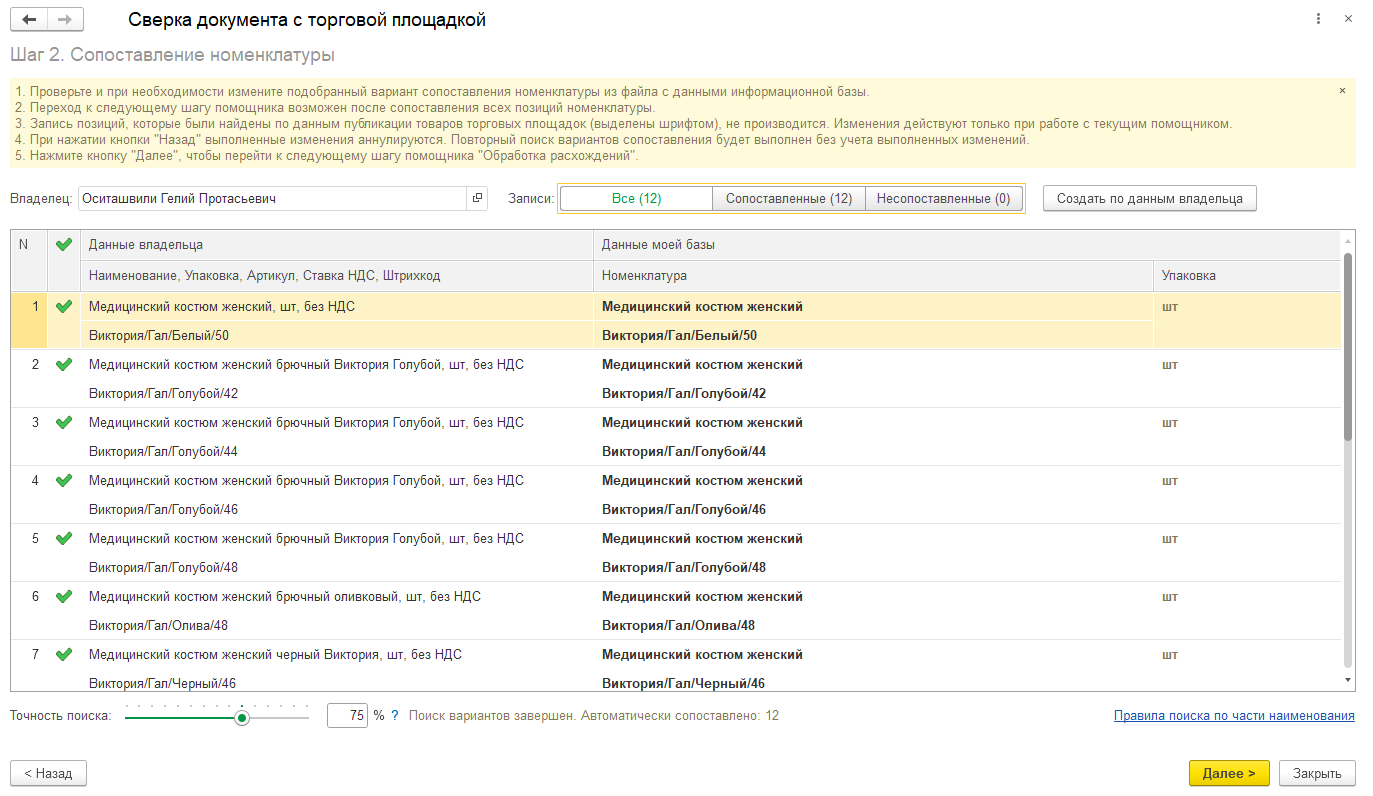На втором шаге выполняется сопоставление номенклатуры. Если сопоставление номенклатуры в настройках интеграции с торговой площадки завершено не в полном объеме или учетная запись не является объектом интеграций (не Ozon и не Яндекс Маркет), требуется сопоставить полученные сведения с учетной системой стандартными механизмами БЭД.