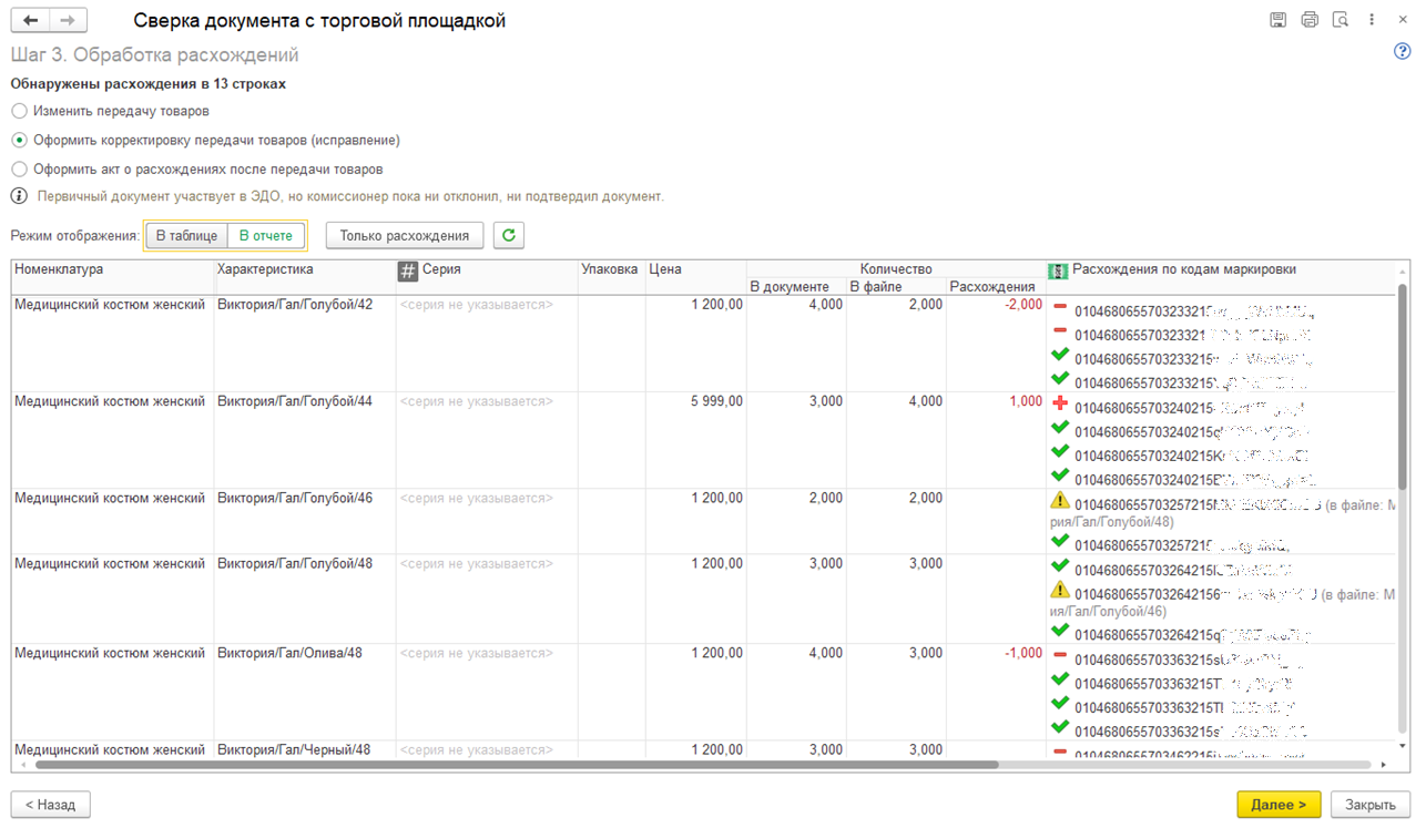 На третьем шаге выполняется обработка расхождений. Предусмотрен переключатель Режим отображения: В таблице / В отчете. Возможен показ только обнаруженных расхождений. В режиме В таблице расхождения отображаются в виде таблицы, аналогичной документу Акт о расхождениях после отгрузки. По гиперссылке в графе Расхождения по кодам маркировки открывается форма с расширенной информацией.