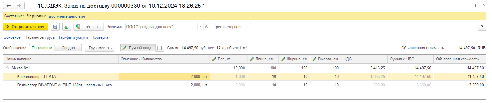 ● Интернет-магазин (по умолчанию) - расширенный вариант доставки. Для этого варианта обязательно указание всех вложений (товары с артикулами), страхование груза. Есть возможность использовать наложенный платеж. Заказ данного типа оформляется только с указанием документов-оснований, из которых будет браться стоимость и все информация по товарам.
