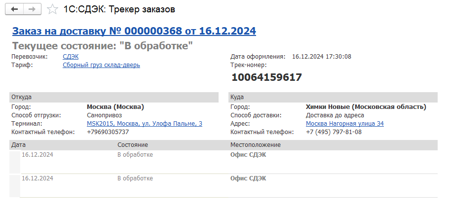 ■ открытие карточки отслеживания по трек номеру в форме 1С – ссылка в графе с трек-номером